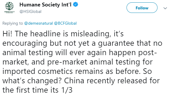 Entretanto, apesar da China ter anunciado que os testes PÓS-comercialização para produtos finais importados e produzidos na China não iriam incluir testes em animais, a HSI (Humane Society International) afirmou que a notícia foi apenas “encorajadora”, mas que não garante que nenhum teste em animais ocorra de novo na pós-comercialização. Ainda explicou que testes em animais pré-comercialização para cosméticos importados permanecem como antes. Confira abaixo: