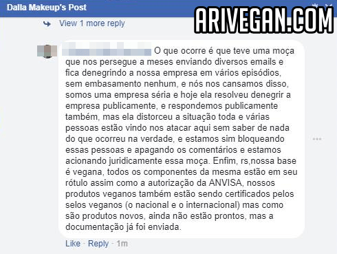 Após ver alguns anúncios da Dalla Makeup na internet e ir comprar sua base pois não entendia tudo sobre veganismo naquela época, e a marca e todas as blogueiras que a divulgavam diziam que era vegana, entrei em contato com a marca pela sua fanpage oficial no Facebook e tentei também contato pelo e-mail da marca pois era um procedimento que via muitos veganos fazerem também. Sendo que esse é o procedimento padrão de veganos antes de comprar um produto (e inclusive, existem grupos veganos enormes no Facebook focados somente em publicar respostas das empresas aos consumidores, para termos conhecimento se ela é verdadeiramente vegana ou não). Então, tenham algo em mente: não é pelo motivo da marca dizer no rótulo que um produto é vegano, que ele realmente seja vegano. Não acreditem somente na palavra das marcas, elas querem apenas lucro. E os veganos (assim como eu hoje em dia), sabem muito bem disso. Afinal, já fomos enganados diversas vezes por marcas supostamente “veganas”, mas que no fim não eram veganas. Agora nos reunimos e passamos a informação que temos para outros veganos, e assim criamos um círculo de conhecimento sobre marcas veganas e/ou não veganas.