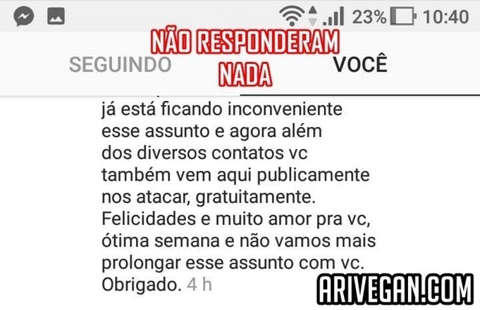 A marca me bloqueou em seu Instagram, e apagou DEZENAS de comentários de veganos, e bloqueou outros veganos buscando informações em sua fanpage no Facebook.