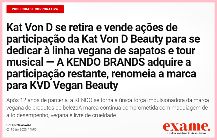 “Kat Von D se retira e vende ações de participação da Kat Von D Beauty para se dedicar à linha vegana de sapatos e tour musical — A KENDO BRANDS adquire a participação restante, renomeia a marca para KVD Vegan Beauty”